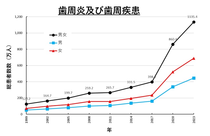 厚生労働省の調査によると、2023年時点で歯周病の患者数は1135万人を超えており、高血圧に次いで2番目に多い国民病と言える状態です。しかも年々増加傾向にあります。