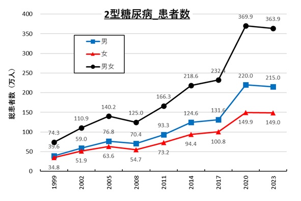 2023年の厚生労働省の調査によると、2型糖尿病の患者数は 363.9万人。これは国内で4番目に多い患者数で、1999年の約74万人から24年間で5倍近く増加しています。一方、1型糖尿病は約12万人で、この数はほぼ横ばい、ないし減少傾向です。